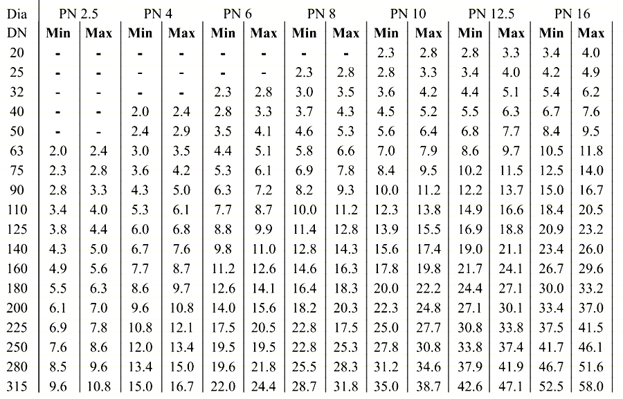 Wall thickness of pipes (PE-80) for pressure rating of IS:4984