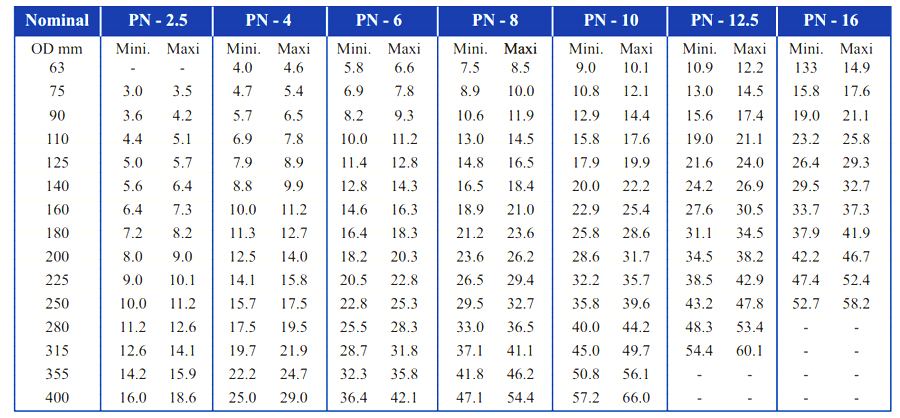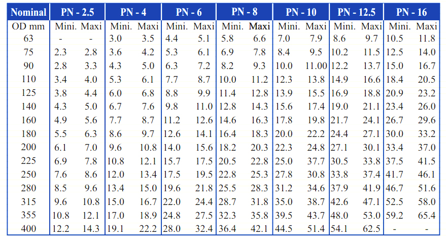 Wall thickness of pipes (PE-63) for pressure rating of IS : 14333-1996 with latest amendments